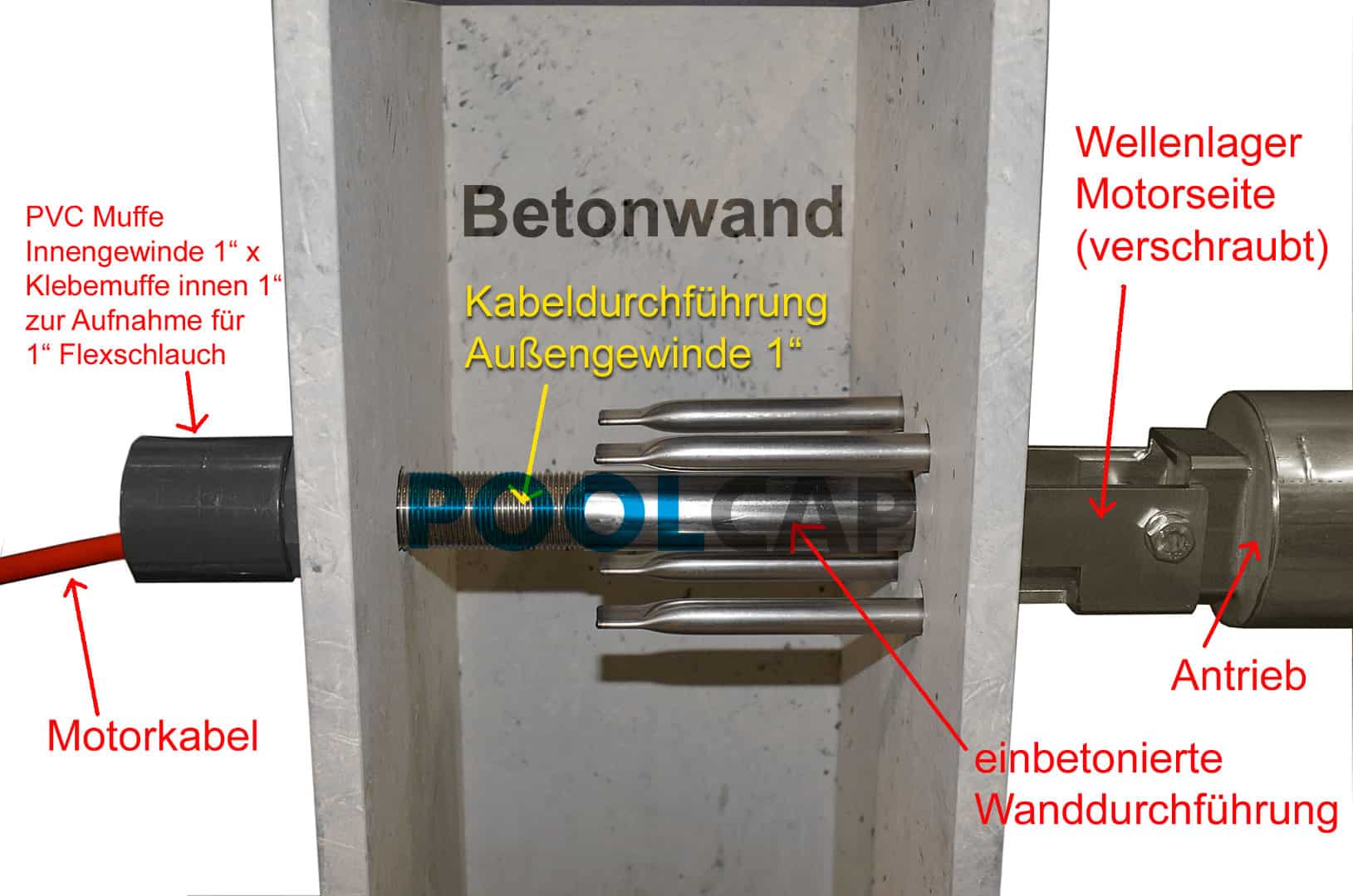 Mauerdurchführung classical mit Folienflansch, Motorwellenlagerung und Simmerringen.